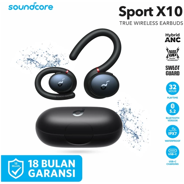 אוזניות Soundcore Sport X10 / מארז טעינה / 5 מתאמים (XS / S / M / L / XL) / כבל טעינה USB Type-C / מדריך למשתמש וכתב אחריות